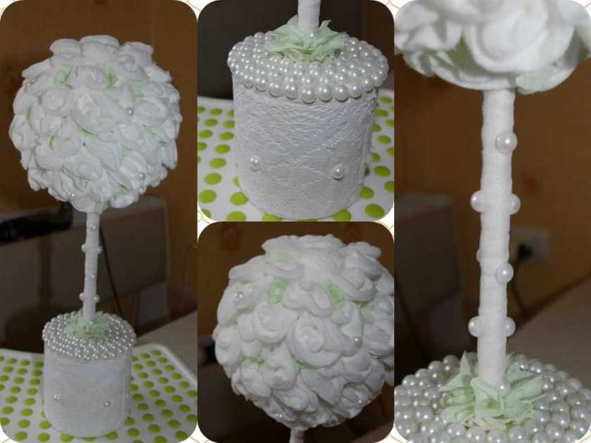 Есть много уроков о том, как сделать топиарий своими руками для начинающих, пошаговое фото которых можно найти в Интернет. Рассмотрим на примере изготовления простого украшения из ватных дисков основные этапы работы. Необходимо приготовить: