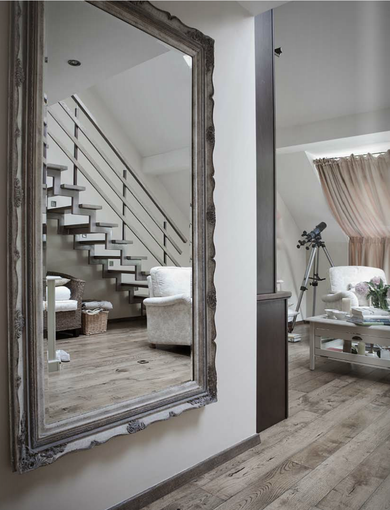 Если зеркало расположено в горизонтальной плоскости, помещение визуально расширяется, а потолок будет казаться ниже. Крупные вертикальные зеркальные элементы, напротив, подойдут для низких потолков.