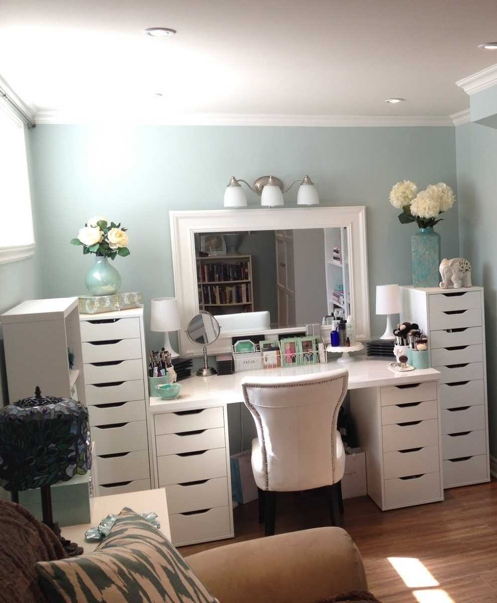 Первый вид занимает меньшую площадь, поэтому может быть установлен даже в небольшой спальне. За счет особенностей конструкции их ящики получаются довольно большие и они с легкостью смогут в себя вместить все необходимое – от кремов до помады.