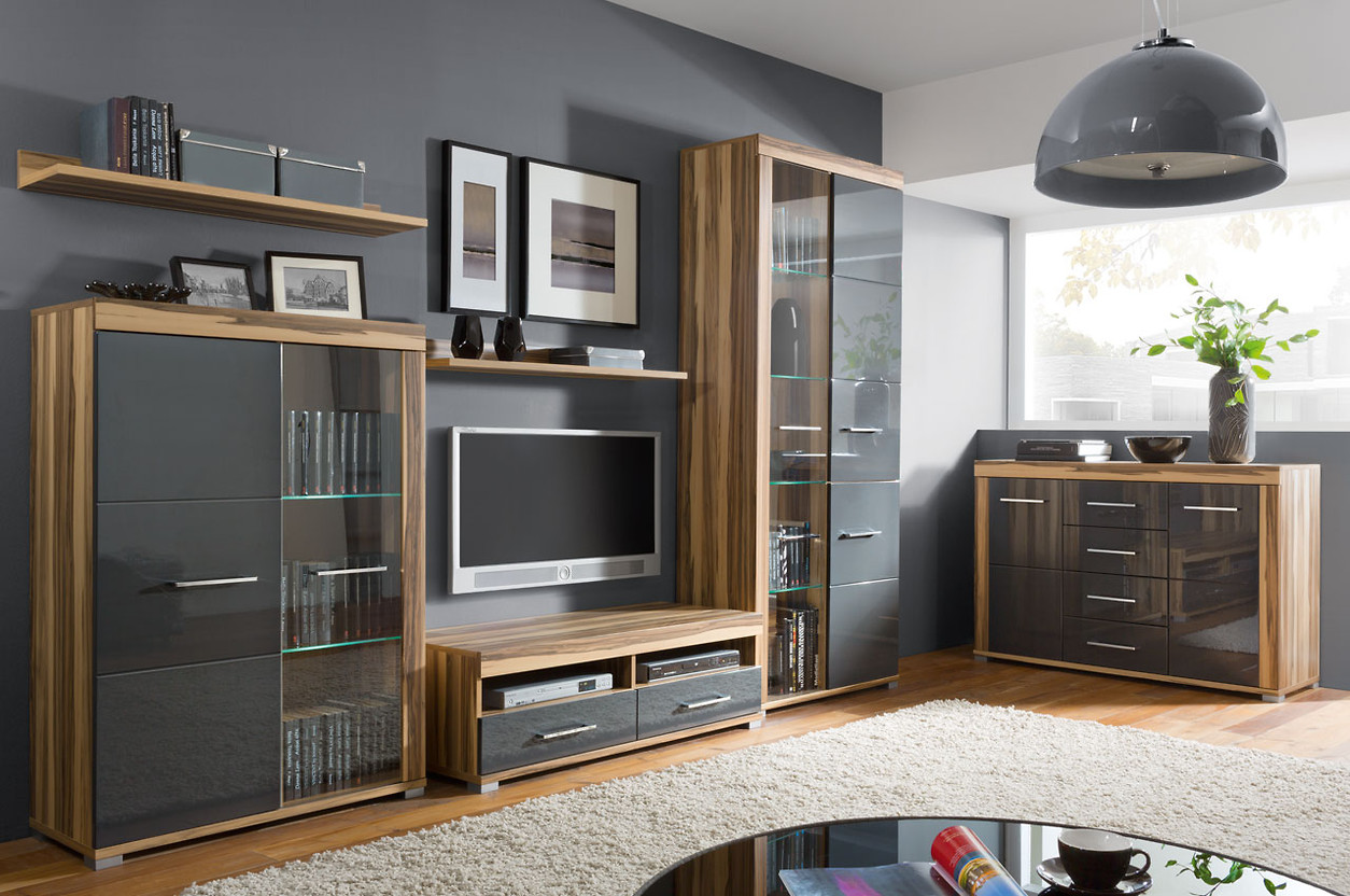 - Корпусная мебель – классический выбор для гостиной. Это удобно, практично, красиво. Угловой вариант позволяет сэкономить место. Выполнение в одном дизайне комплекта корпусной мебели помогает создать общий стиль. Гарнитур состоит обычно из множества шкафчиков, полок, тумб, подставки для телевизора. К плюсам относится также сравнительно невысокая стоимость и широкий выбор моделей. Отрицательная сторона – несоответствие модным тенденциям. Подобные предметы мебели уже начали устаревать.