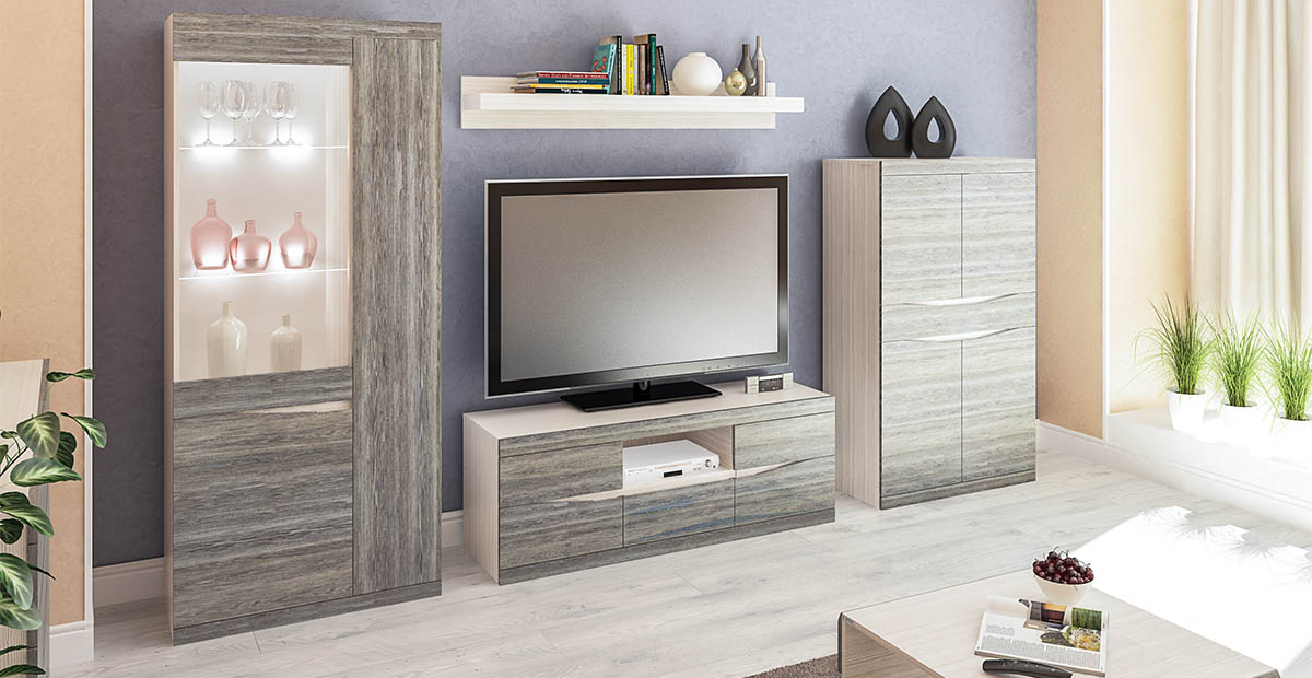 Отличительной чертой модерна является склонность к асимметрии, а в случае с модульным гарнитуром, это возможность располагать секции на разной высоте. Обычно центром композиции становится современный плазменный телевизор, вокруг которого располагают пеналы, навесные шкафы и полки. Фасады ровные, без лишнего декора, присущего классике.