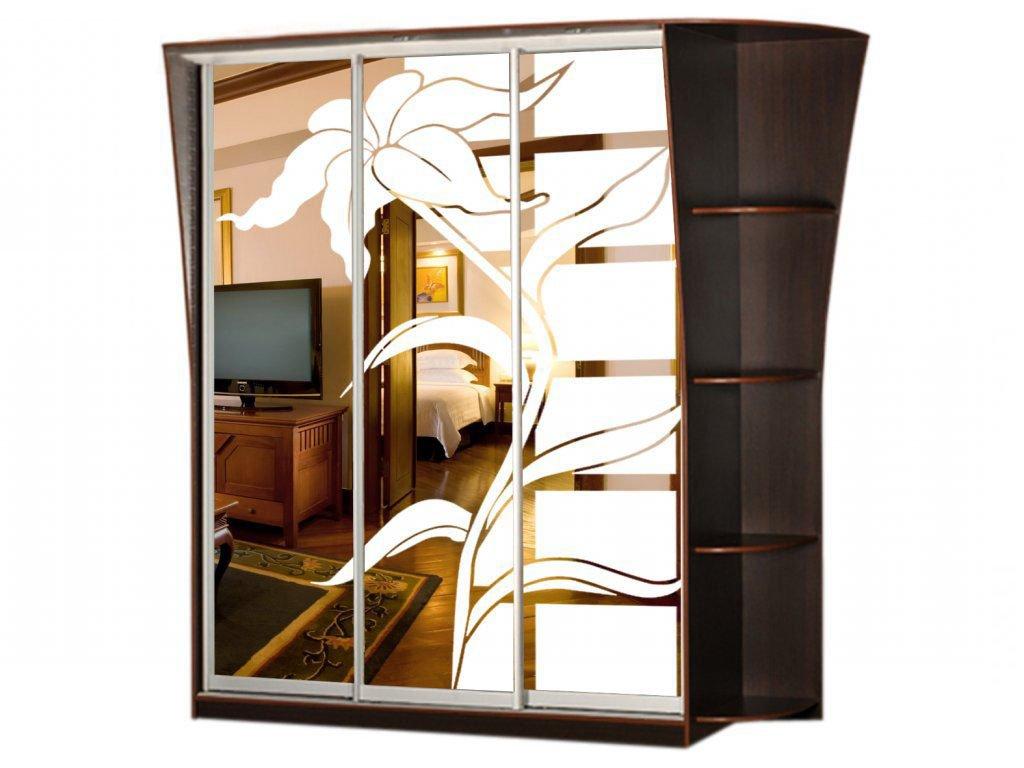 На фото вогнутый шкаф-купе с фотопечатью на стеклянных дверцах