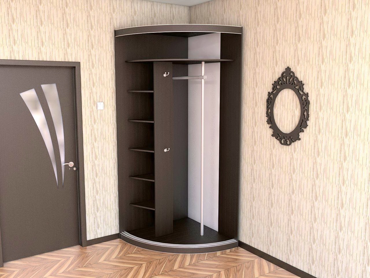 Спецификой этой модели выступает её округлая форма. Корпус с изогнутыми дверцами-купе устанавливается в угол. Такое необычное изделия напоминает компактную гардеробную.