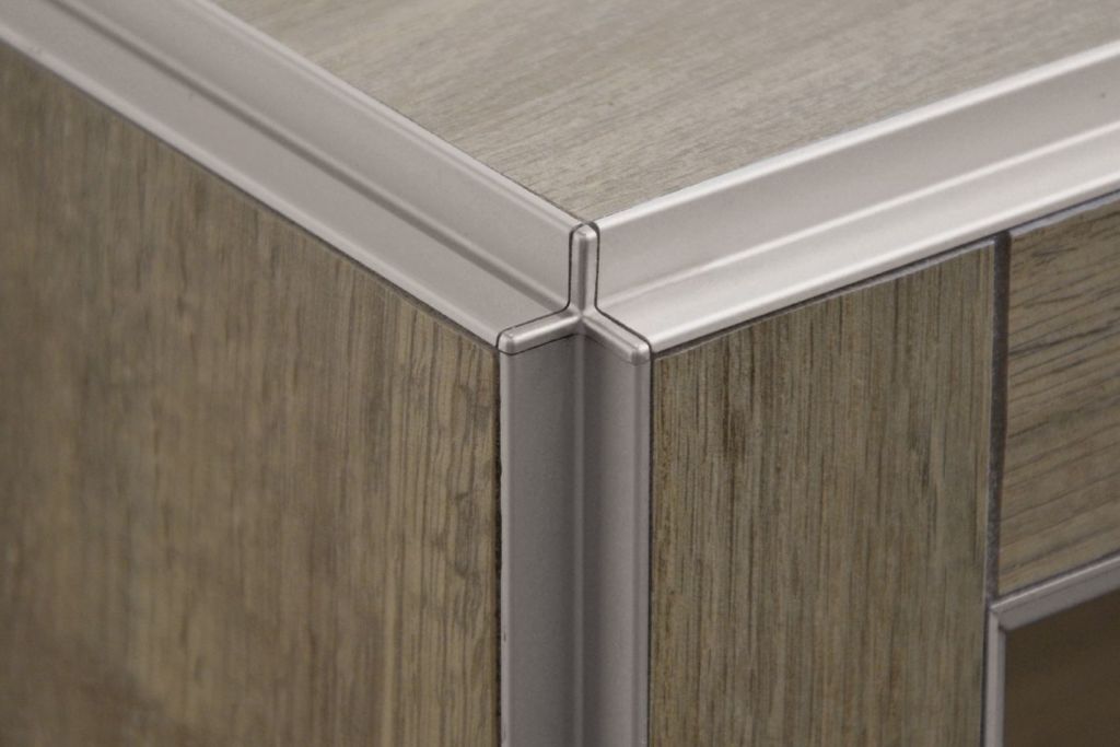 Алюминиевый профиль. Считается универсальным, поскольку гармонирует практически с любым стилем интерьера и со всеми цветовыми решениями. К достоинствам раскладки из алюминия смело можно также отнести высокие прочностные, антикоррозийные и эксплуатационные характеристики и небольшой вес элементов. Алюминиевый трим практически незаменим в тех случаях, когда требуется усиление угла вследствие повышенных механических нагрузок на него.