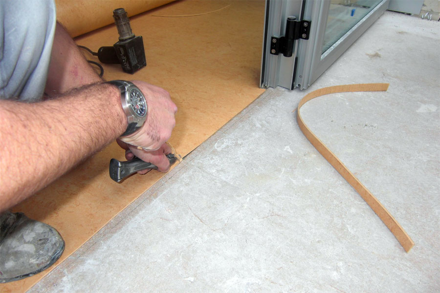 Если необходимо состыковать край листа, то проблем обычно не возникает. Для формирования ровного края у отрезанного листа необходимо уложить два листа с небольшим нахлестом. При помощи линейки проводится разметочная линия. Не убирая линейки, по этой линии проводят строительным ножом, стараясь прорезать оба листа. При таком отрезании края идеально стыкуются. Обрезанные полотнища кладут на постоянное место и фиксируют к основанию пола двухсторонним скотчем или клеем-мастикой.