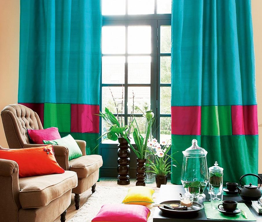 Контрастное сочетание штор разных цветов создаст праздничную атмосферу в гостиной
