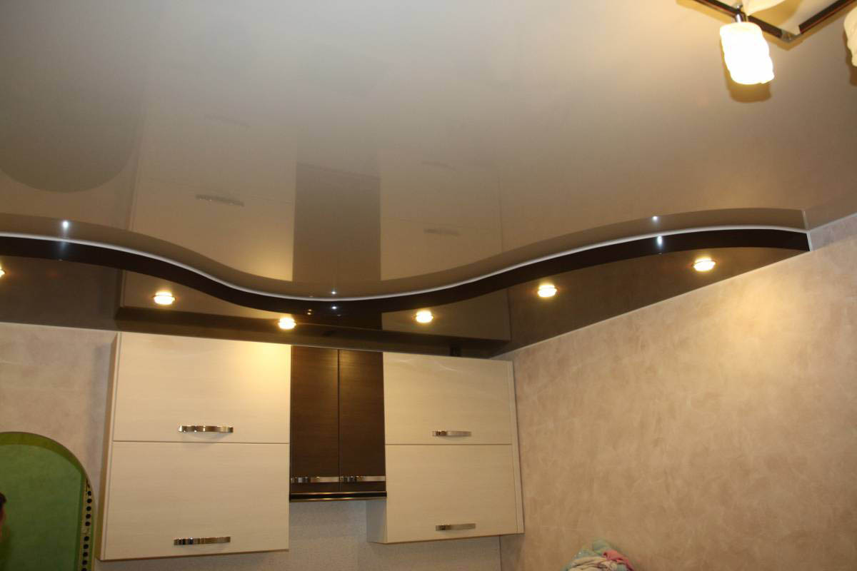 Пленка из ПВХ отличается глянцевой поверхностью. Она придает помещению торжественность и красоту. Такое полотно не пропускает влагу, не боится попадания брызг. Пленку можно устанавливать в ванной, на кухне и в прочих помещениях. Дешевые разновидности материала могут издавать неприятный химический запах. Это наносит вред здоровью. Устанавливать подобные полотна в спальне или детской крайне не рекомендуется.
