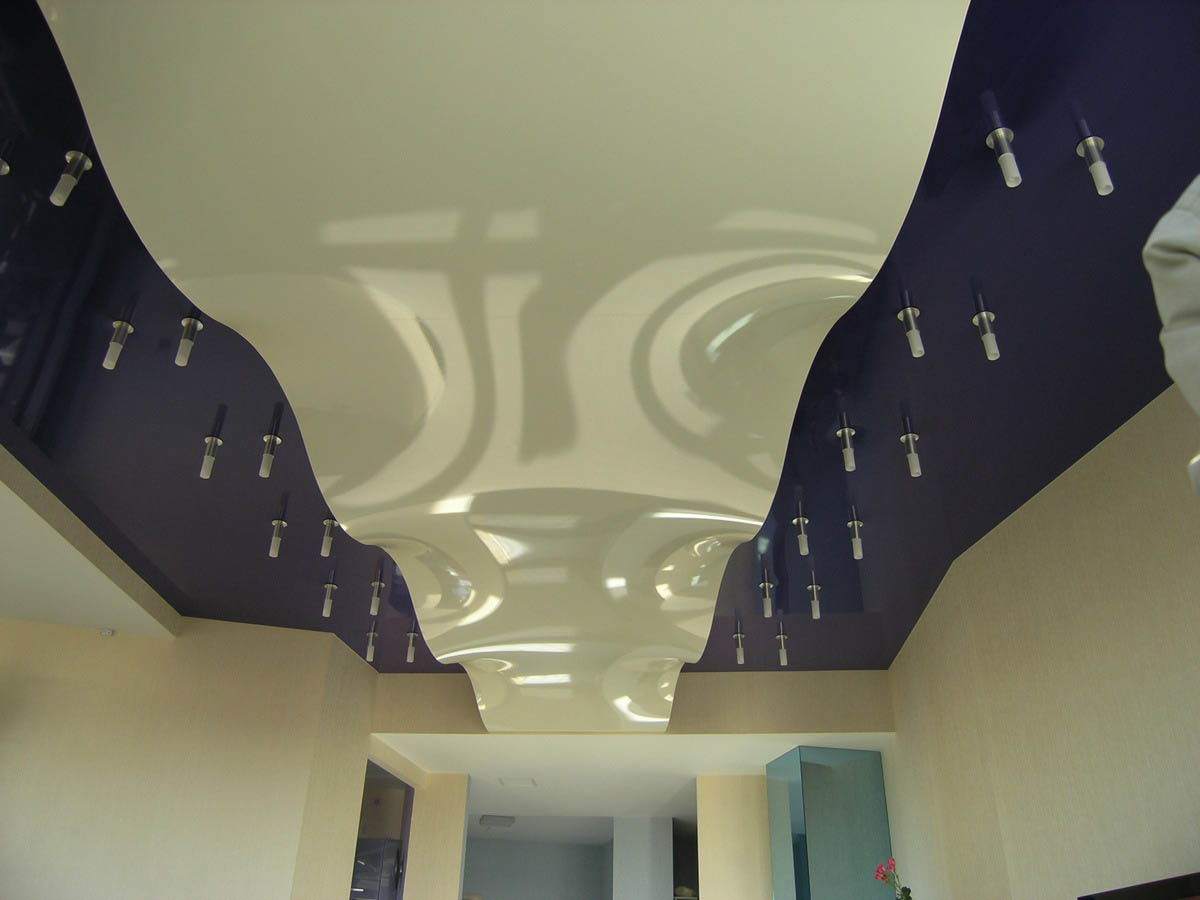 Это еще один способ разнообразить поверхность. Два полотна натянуты на небольшом расстоянии друг от друга. На нижнем, в заводских условиях, просверливаются отверстия. Они размещаются случайным образом или складываются в узнаваемый образ. Размер отверстий может варьироваться от маленького до большого. Перфорация может быть интегрирована с внутренним освещением между уровнями.