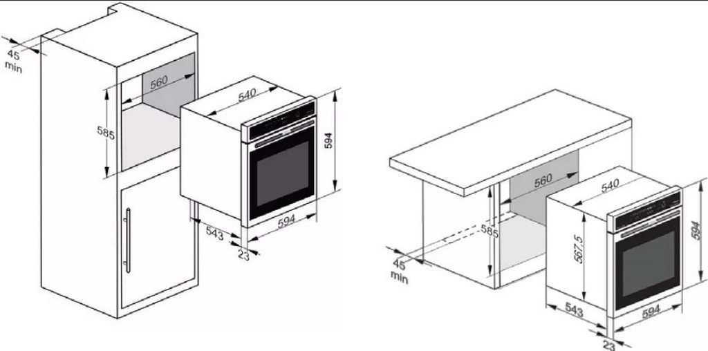 - для обеспечения естественной циркуляции воздуха необходимо предусмотреть зазоры не менее 90 мм снизу, 40-50 мм для боковых и задней стенки духового шкафа;