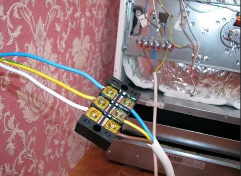 Стоит сказать о самой вилке. Кабель имеет три провода, чаще всего зеленоватого или желтоватого цвета с заземлением. Он подключается к клемме заземления. Оставшиеся два провода подключены к двум различным клеммам. Контакты должны быть надежно зажаты. Функциональность устройства проверяется в конце монтажа.