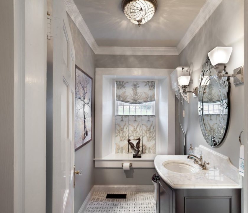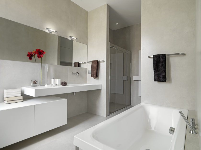 Для этого за основу всегда берется светлый оттенок: белоснежный, беж, серый, пастельный. Его рекомендуется использовать на стенах, потолке, сантехнике, крупных объектах (шкаф, тумба).