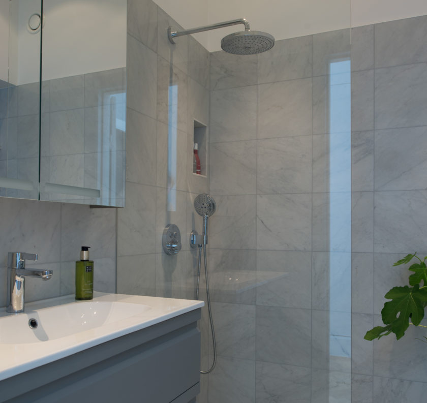Например, блестящая белая плитка должна сочетаться с полированным белым мрамором или белой полированной шестиугольной мозаикой. Эффект многослойности придает комнате стиль, глубину и характер. И не используйте цветные полотенца.