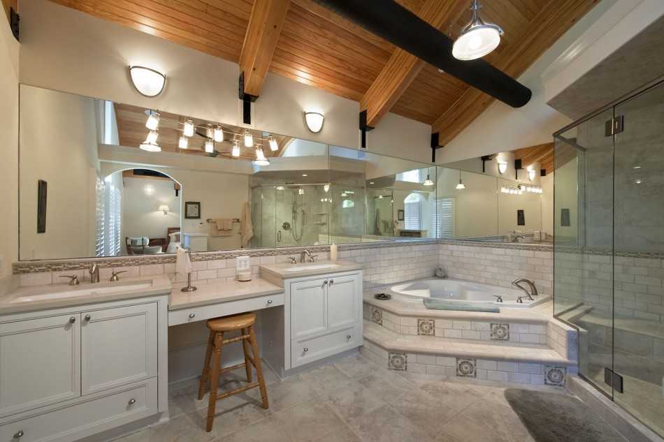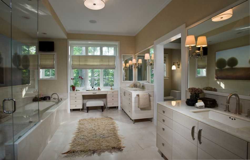 В просторной комнате можно установить ванну большого размераСовет. Если вы хотите установить в совмещенной ванной комнате сразу две раковины, для комфорта между ними желательно выдержать хотя бы минимальное расстояние в 40-50 см.