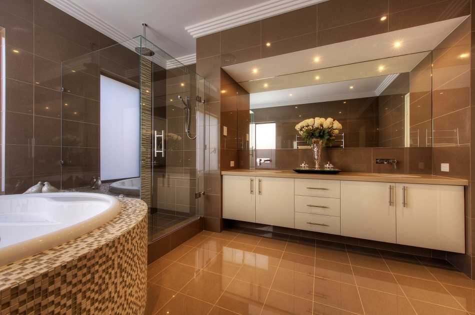 Выбор отделочных материалов для ванных комнат больших размеров достаточно широк. Более того, дизайнерами часто применяется комбинирование разнообразных видов облицовки для придания наибольшей эстетики помещению. Сочетание разных по фактуре и цвету элементов позволяет создавать наиболее красивые и оригинальные образы интерьера.