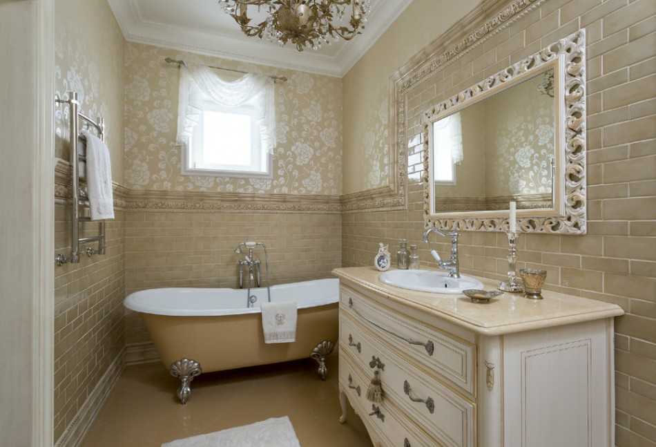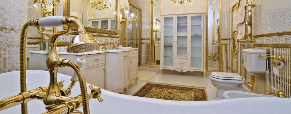 Традиционно в классическом стиле используются ванны овальных форм со слегка завышенными спинками. Модные бочки или же прямоугольные модели для такого интерьера не подойдут категорически. Дополняют ванну медными или позолоченными изогнутыми ножками. Они могут иметь изящную форму или быть выполнены в виде сидящих львов, тигров, цветов, ракушек, миниатюрных статуэток, поддерживающих на плечах «чашу». Если площадь комнаты позволяет (более 12 кв.м.), то ванну располагают в центре. Оригинальное решение позволит владельцам почувствовать себя особами голубых кровей, которые имеют в своем распоряжении поистине королевские апартаменты для проведения гигиенических процедур. Кстати, стильным дополнением станет изящный кувшин, выполняющий в большей степени декоративную функцию. Также ванну украшают мозаикой. Конечно для декорирования используют не кусочки разноцветных стекол. В ход идет современная керамическая плитка, которую укладывают в мозаичной технике.