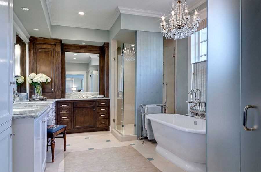 Классическая люстра является не просто осветительным прибором, но и важным элементом интерьера классической ванной комнаты. Она может быть изготовлена из металла, хрусталя или стекла, либо сочетать все эти материалы вместе. Для большой ванной комнаты подойдут подвесные хрустальные люстры или варианты с плафонами округлой формы или в виде цветков. Для ванных комнат с низким потолком можно использовать оригинальные потолочные люстры. Главным требованием к осветительным приборам для ванной комнаты является их влагозащищенность, что должно быть указано в паспорте к изделию. Люстра в ванную комнату в классическом стиле представлена ниже в нашей фото подборке.