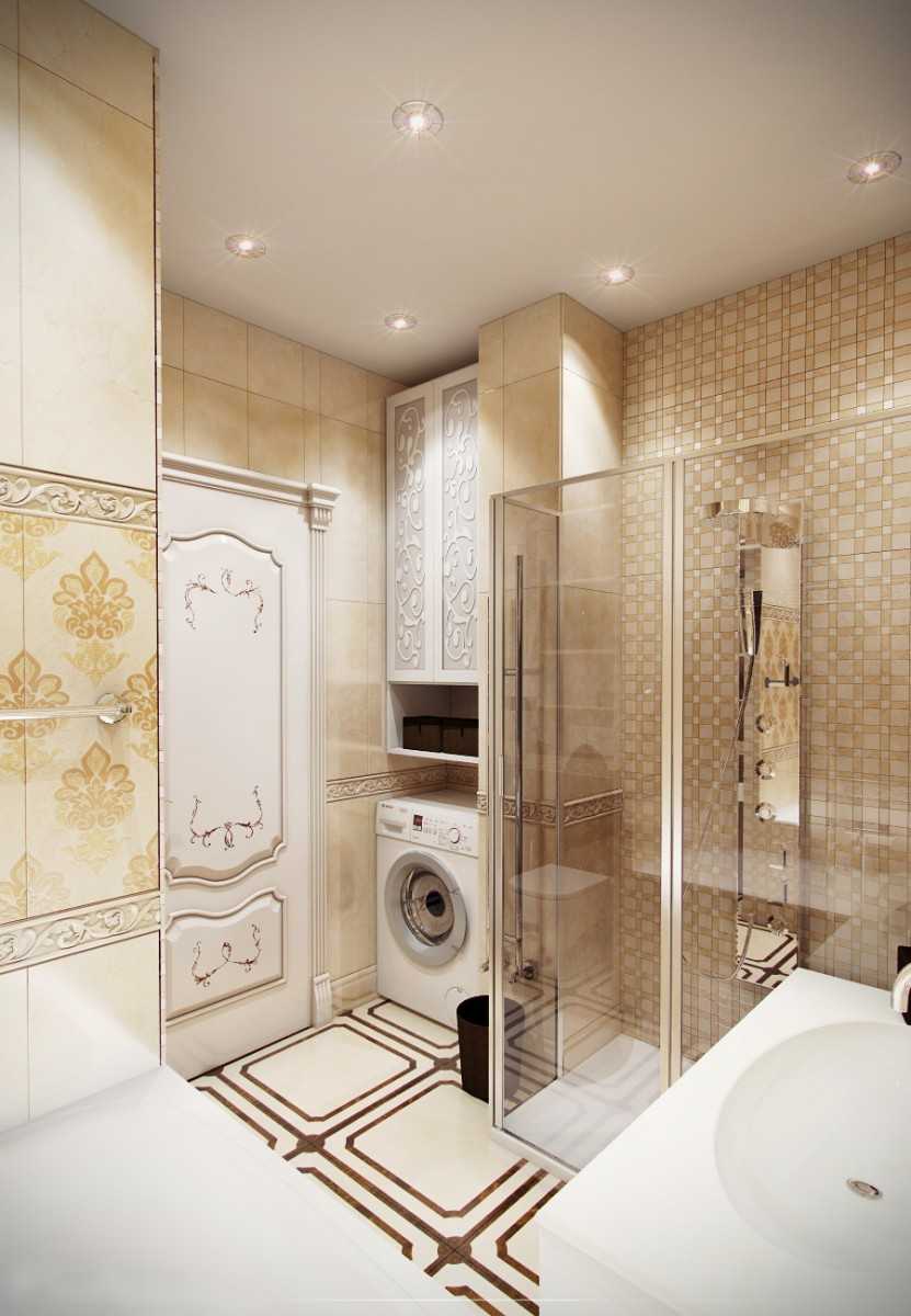 Основное внимание уделяют стенкам душевой. Их помещают в «золотую» раму, а поверхность украшают орнаментом. Душевую кабинку обычно используют в маленьких помещениях, где расположение ванны сильно затруднит передвижение по комнате и подчеркнет все недостатки пространства