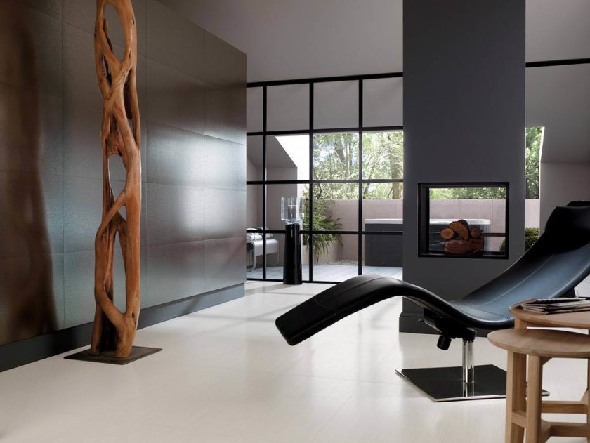 Для отделки пола также подойдёт керамическая плитка. Так как минимализм тяготеет к натуральным материалам, можно подобрать покрытие, стилизованное под дерево. Очень стильно смотрится и наливной пол нейтральных оттенков.