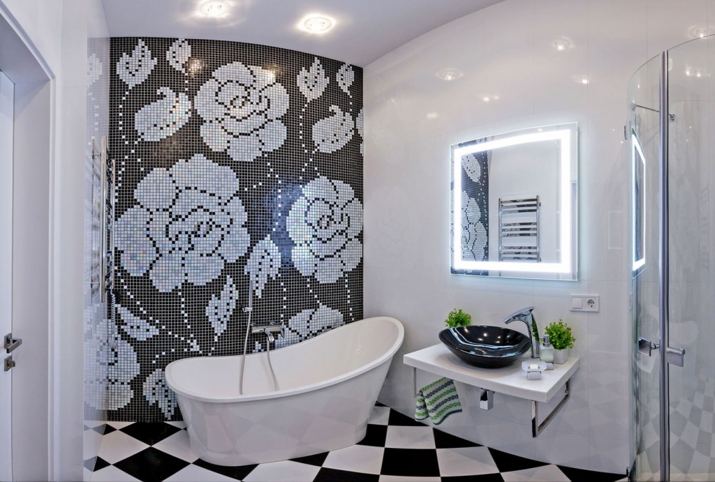 Интересный способ придать ванной комнате характер — покрыть чашу для купания различными отделочными материалами: деревом, плиткой, имитирующей натуральное сырье, такое как камень, шпон или бетон. Как правило, выбор падает на керамическую плитку, поверхность которой легко моется, устойчива к влаге и частому контакту с водой, а также не создает проблем при эксплуатации
