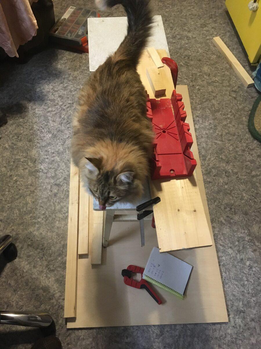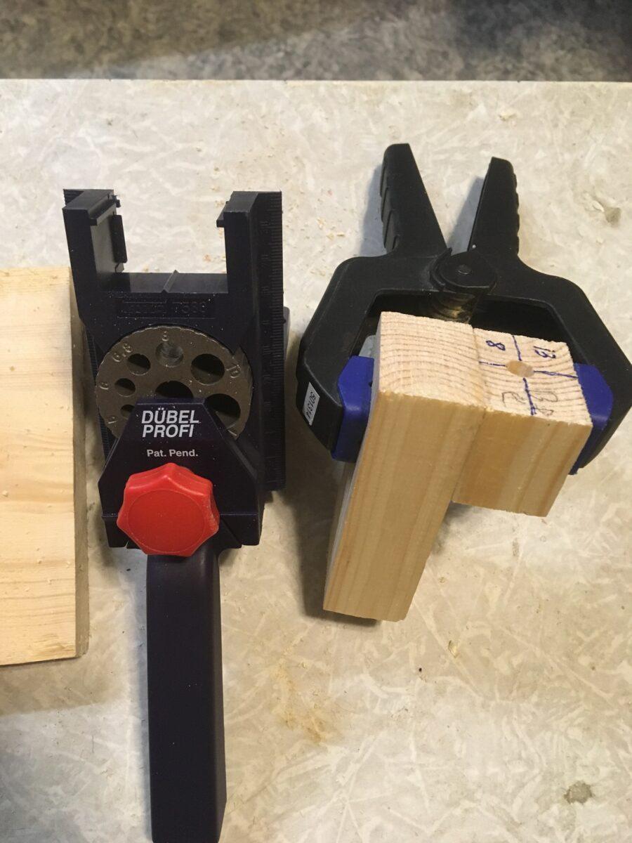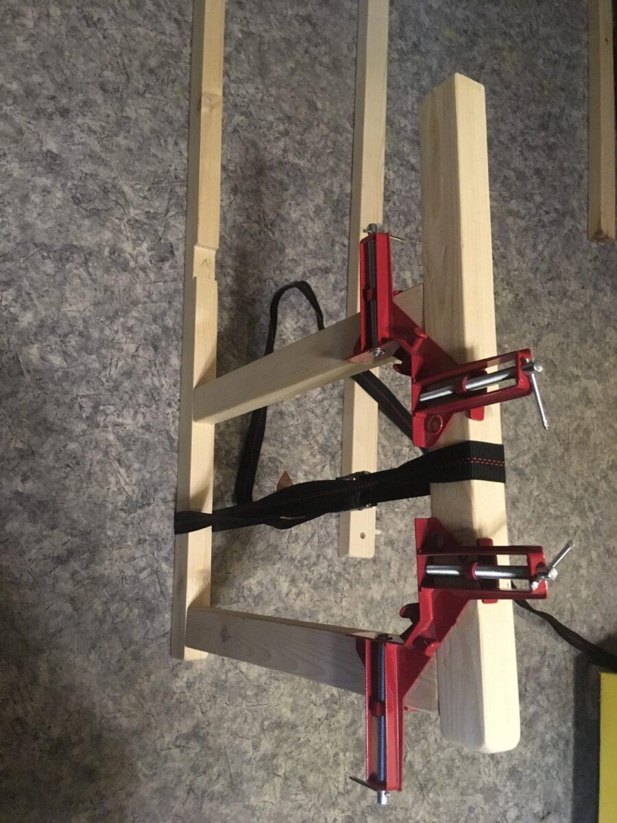 Самая большая сложность — сделать устойчивый низ вешалки. Чтобы сделать перекладины точно под углом 45 к нижней части лучше выравнивать стык при помощи угольника. Затем нужно прикрутить рейки. Конструкция боковой части готова: