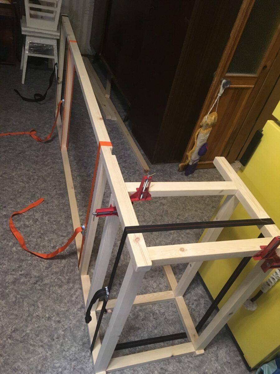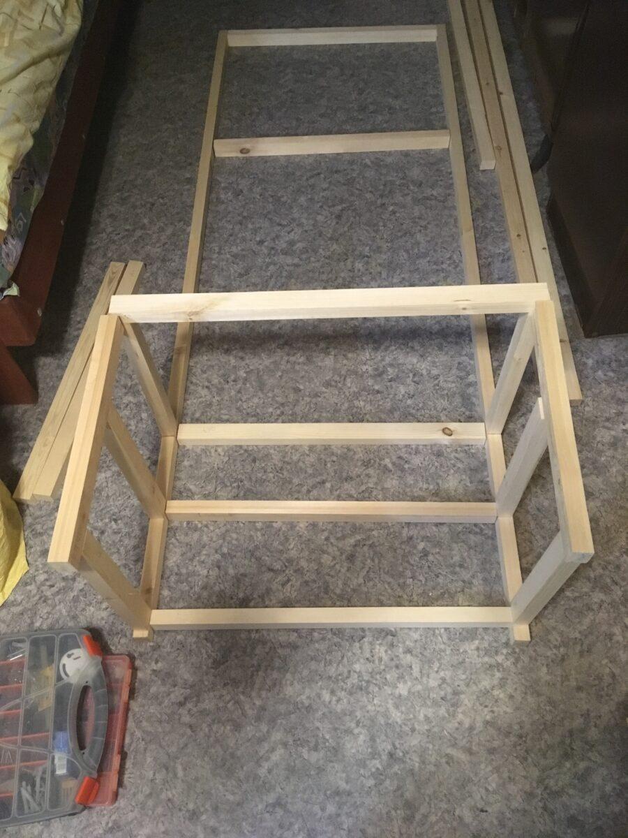 - Верхняя перекладина прикручивается длинными шурупами. На низ прикручиваются колесики, которые можно купить в строительном магазине.