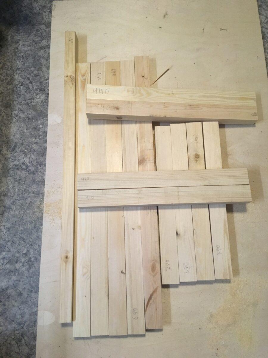 Для работы необходимо купить 2 бруса размером 40×40×2000 см. Для верхней перекладины хорошо подойдет черенок от лопаты. Детали распиливаются по плану: