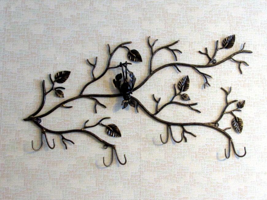 Настенные вешалки предлагают широкий простор для фантазии. Крючки на них обычно тоже металлические, а в остальном допускается разнообразие: