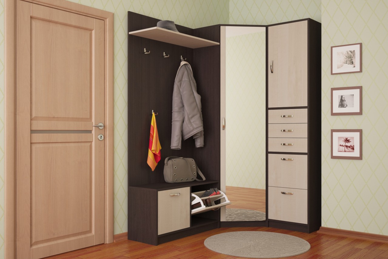 - угловое местонахождение предметов интерьера. Оптимально для любого маленького помещения. Здесь непременно выбирается угловой шкаф. Он является вместительным, занимает он участок, оставляемый обычно вовсе не используемым для разных целей. С одной стороны от него может быть установлен узкий шкаф, оснащенный многочисленными небольшими горизонтальными полками. Он может доходить до другого угла помещения. С другой стороны обычно имеется зеркало и открытия вешалка. Такое решение позволит создать многофункциональное пространство, а при этом все элементы не будут занимать слишком много места;