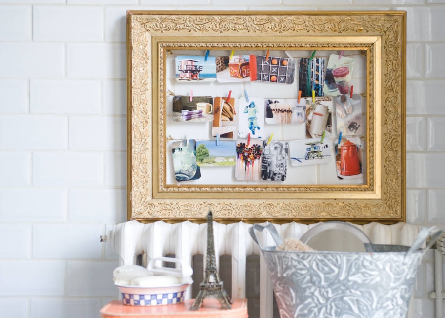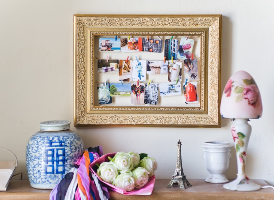 Размещаем фотографии по композиции, которую сняли на телефон. Фиксируем их с помощью маленьких прищепок.