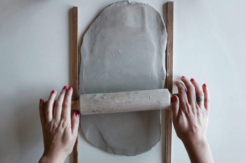 Раскатываем глину до тех пор, пока ее толщина не станет 2 см. После этого кладем по краям рейки и раскатываем ее до тех пор, пока она не станет плоской.