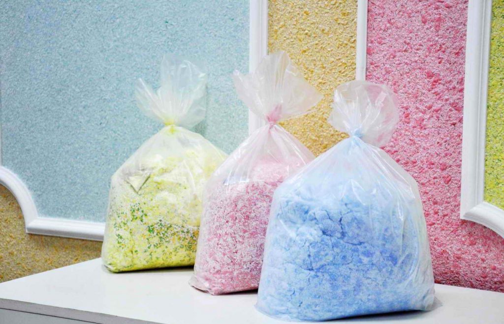Высыпать в емкость с водой блестки и/или краситель (приобретаются отдельно), равномерно распределить его в воде. После этого высыпать основной состав штукатурки, предварительно встряхнув пакет – так содержимое равномерно распределится.