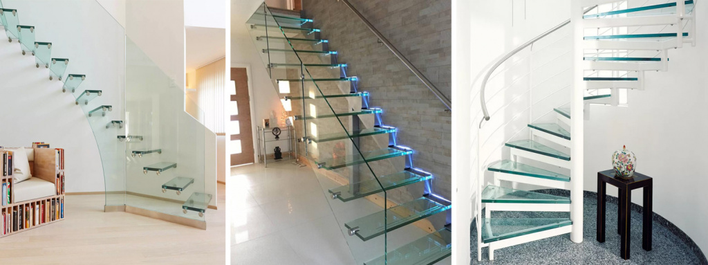 В создании лестниц применяют усиленное стекло, которое может являться разным элементом сооружения. К примеру, из него делают ступени, а также перила. Стекло обладает возможностью делать любую конструкцию более легкой и воздушной, оно вносит в интерьер ощущение простора даже при ограниченном пространстве. Оно отлично сочетается с другими материалами, из которых делают лестничные конструкции.