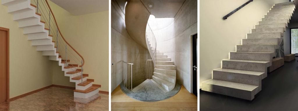 Винтовые. Ступени располагаются по кругу, внутри опора, радиус круга равен длине ступеней. Абсолютно все ступени могут быть поворотными, соотношение узкая/широкая стороны 10/25 см. Высота ступеней определяется аналогично маршевым конструкциям. Во время расчетов надо учитывать размеры пролета, ступеней, опоры, форму ступеней (узкая/широкая части 20/40 см)