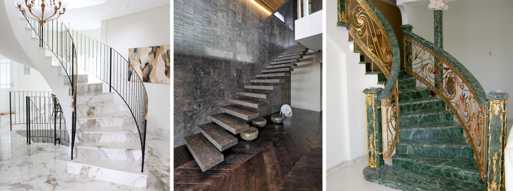 Камень для лестниц используют реже двух предыдущих типов материалов. В зависимости от финансовых возможностей выбирают искусственный либо натуральный материал. Выглядит такая лестница дорого, указывая на высокий статус хозяев дома. При этом она выделяется фактурой, характеризуется гигиеничностью, прочностью и служит десятилетиями. Однако большую выразительность камень обретает при сочетании с металлом. Его цвет подбирают в тон одного из акцентов интерьера.