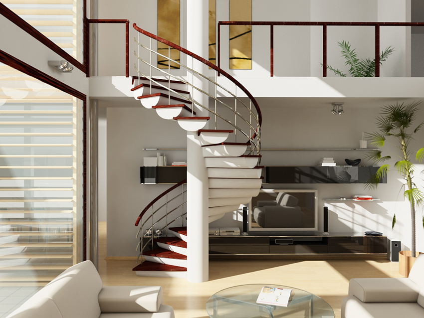 Винтовые лестницы могут иметь футуристический вид.Такие модели хорошо вписываются в стили минимализм, хай-тек и другие современные направления в оформлении помещенийС перилами и без перил — выбор ваш