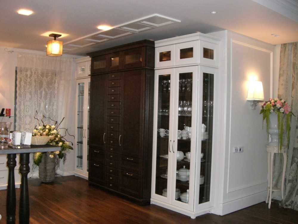 Немаловажный момент: располагать мебель нужно таким образом, чтобы на нее попадало максимальное количество света. Так будет лучше видна вся дорогая посуда. Также можно использовать подсветку для более эффектной демонстрации содержимого шкафа.