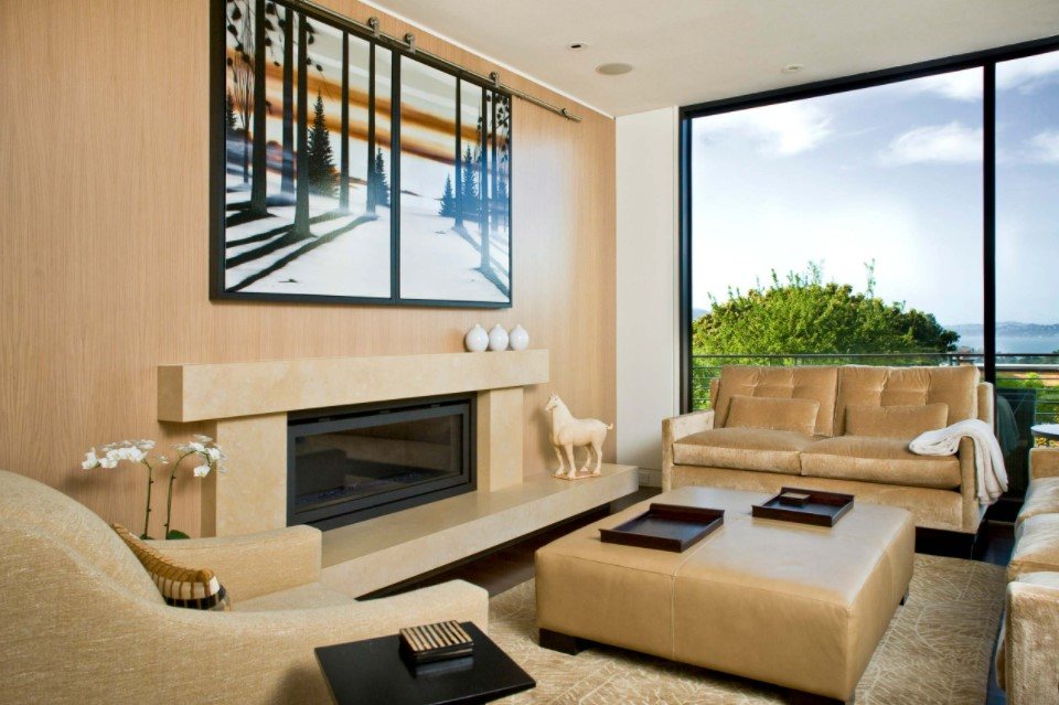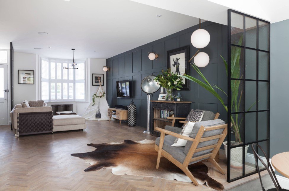 Способ центрального размещения дивана хорошо сочетается с современными стилями, не загромождающими гостиную корпусной мебелью и декором