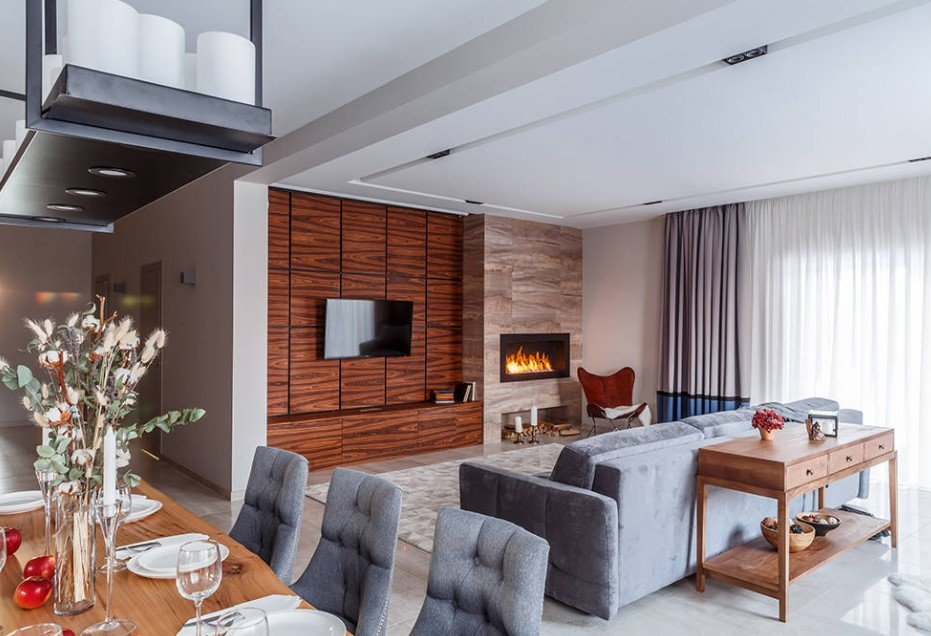 Достаточно популярными считаются комбинированные изделия со встроенным камином или рабочей зоной с выкатным, выдвижным письменным или компьютерным столом, который может использоваться только в случае необходимости. Такое решение особенно уместно для зала, имеющего скромную площадь.