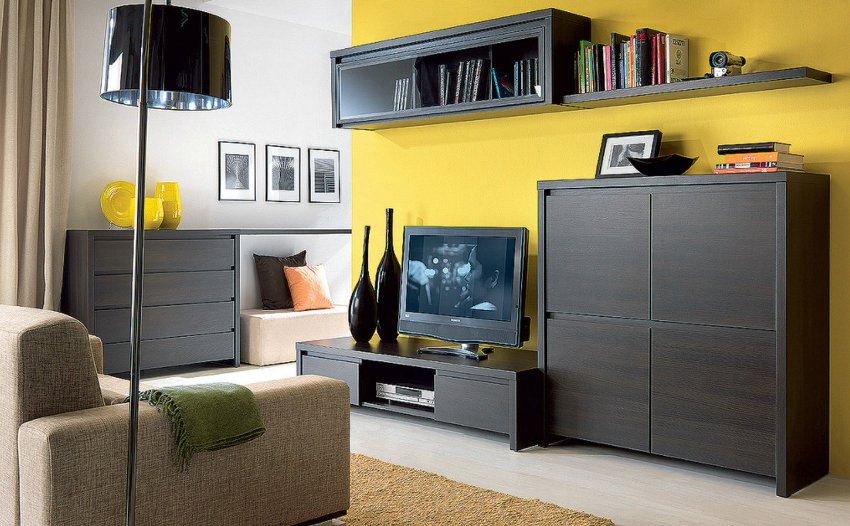 Светлой отделке подходит темный шкаф, темной отделке – светлый аналог соответственно. Гостиная со шкафом в современном стиле выделяется плавными линиями и минимумом деталей. Поэтому фасад этого изделия идет преимущественно закрытым.