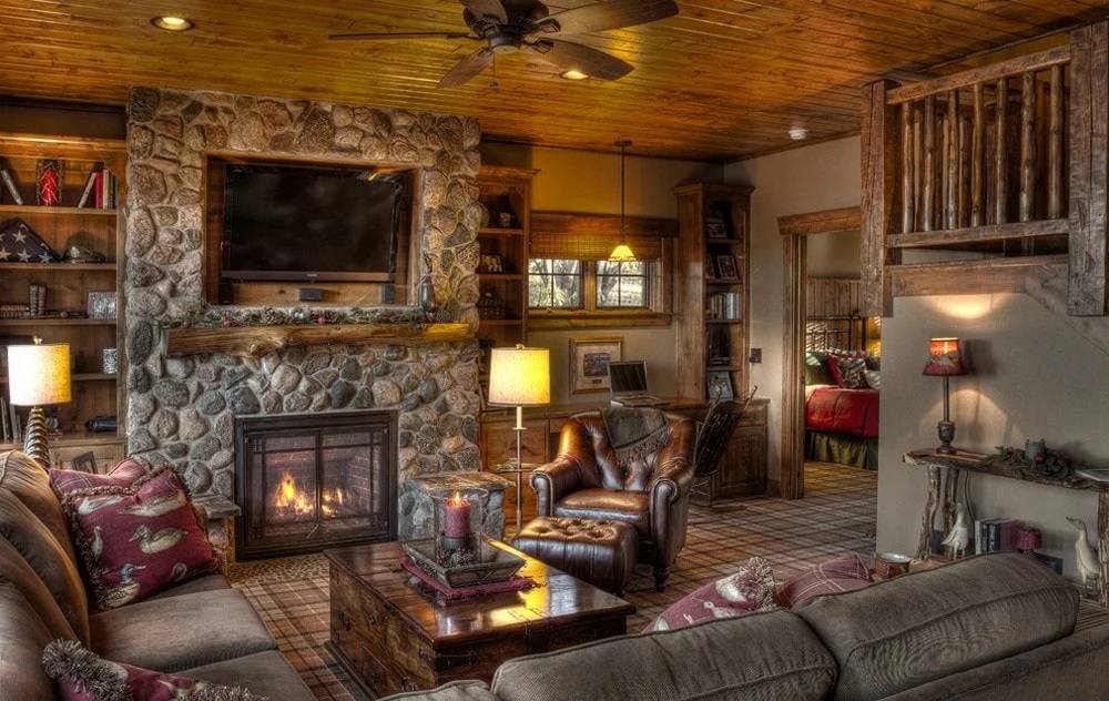 Интерьер дома из оцилиндрованного бревна стиля кантри — это грубая простота без изысков, добротные рукотворные изделия из природных материалов, легкий беспорядок, отсутствие ярких акцентов. Центр гостиной обязательно занимает камин — каменный или кирпичный, на крайний случай электрический. Напольные покрытия — сосновая доска, плитка из песчаника, сланца или же ламинат, имитирующий натуральные материалы.