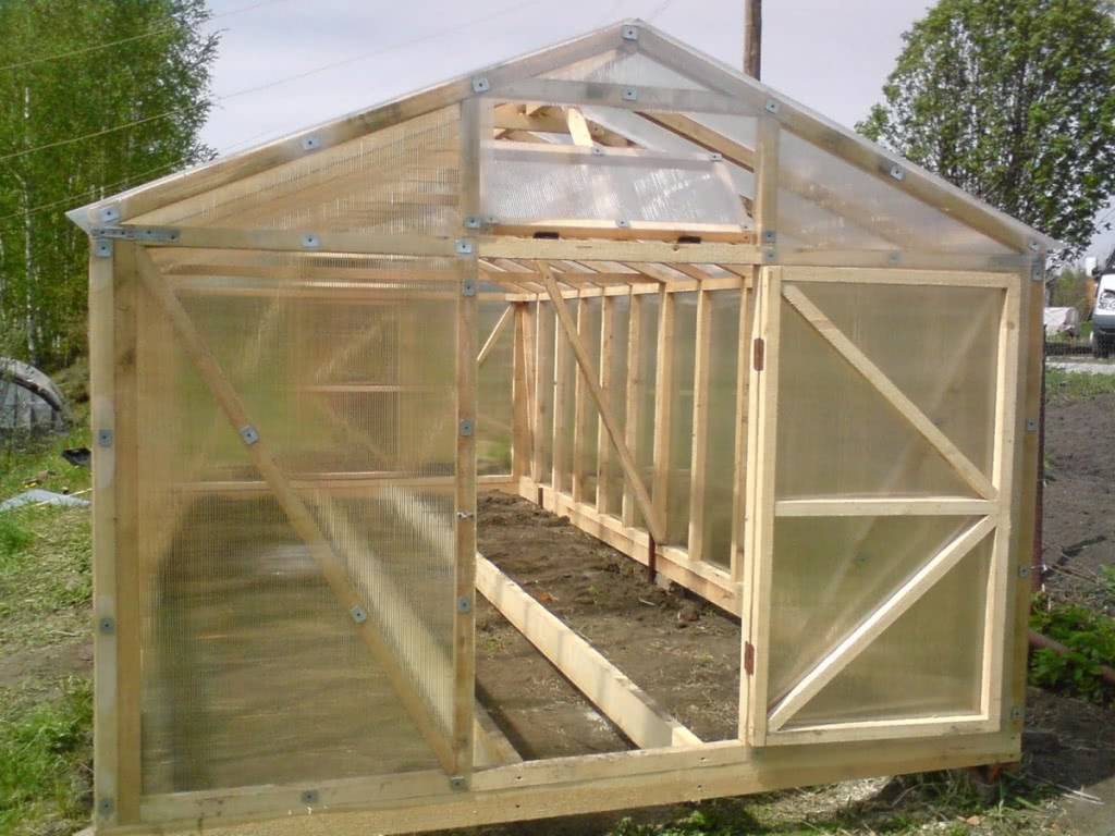Высокая надежность подобных теплиц гарантируется только при наличии фундамента, а, значит, перенести ее будет непросто. На нее потребуется больше материала, необходим более толстый поликарбонат для покрытия.