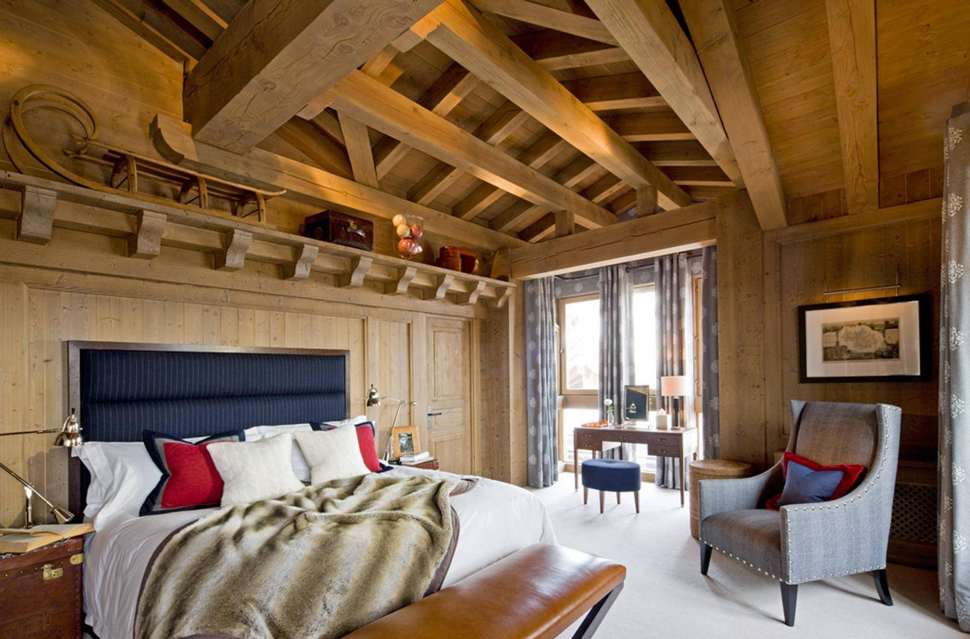 Коттедж в стиле шале, адаптированный для городской архитектуры, сохраняет основные законы шотландского охотничьего домика — покатая крыша с сильным уклоном и такая же геометрия внутри. Двойной ряд окон в точности повторяет потолочный абрис. Дизайнером принято решение лишь слегка задрапировать панорамное французское окно льняными шторами пастельных оттенков и прозрачными занавесями из черного гипюра. Черные балки, светильники в стиле лофт, комбинированные шторы создают графичный ансамбль.