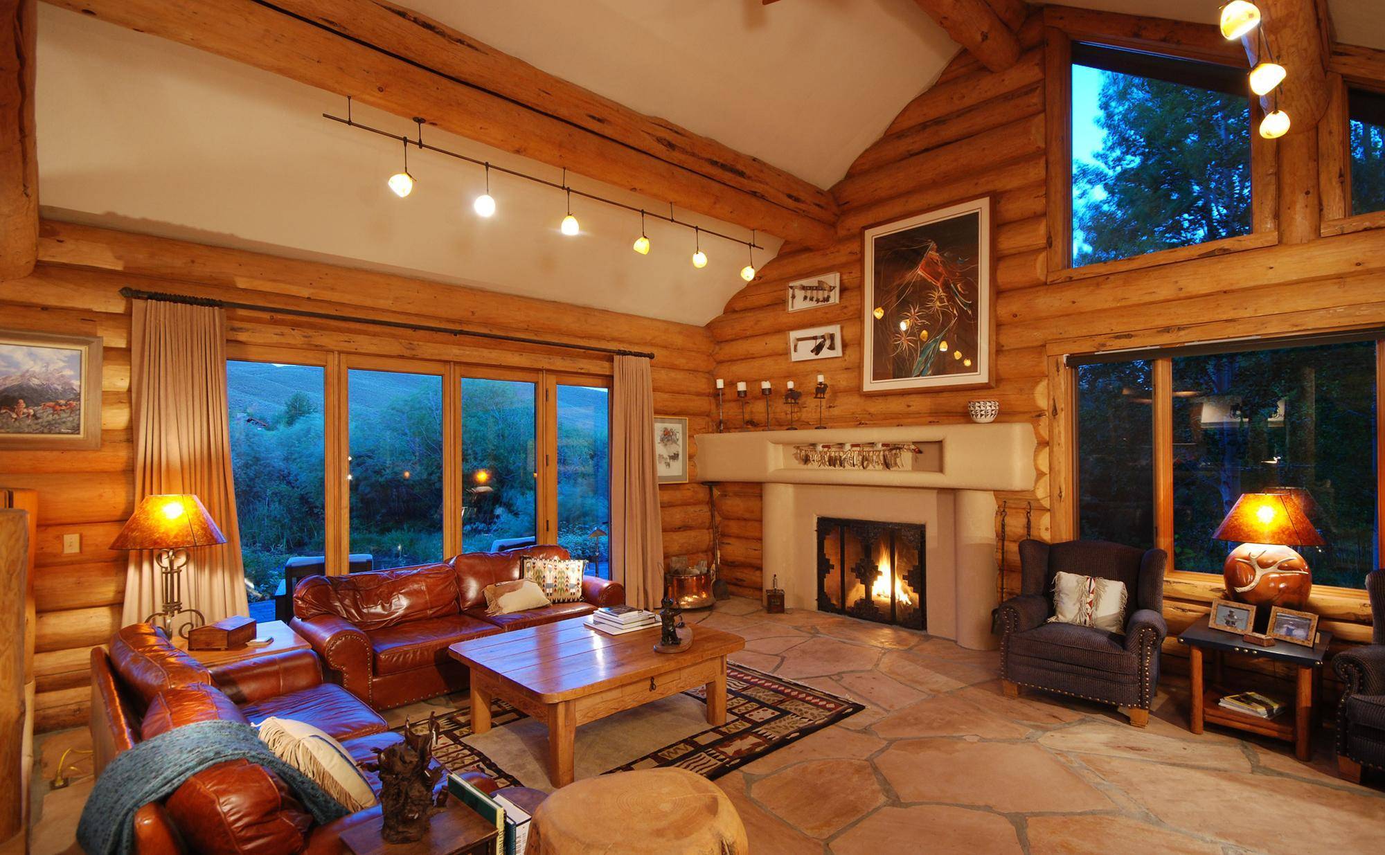 Интерьер загородного дома с большими окнами