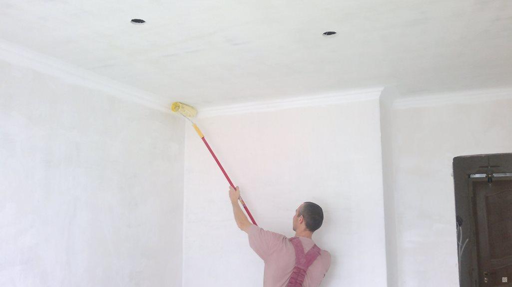 - В новостройках поверхность под покраску готовят с нуля. Иногда применяют армированную сетку и шпаклюют стартом, затем финишем выравнивают потолок.