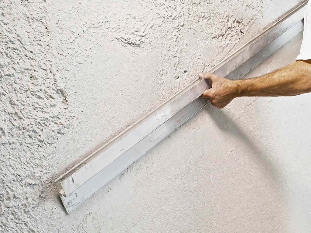 - Опираясь правилом на основную ровную плоскость стены, протяните его по раствору, срезая излишек.