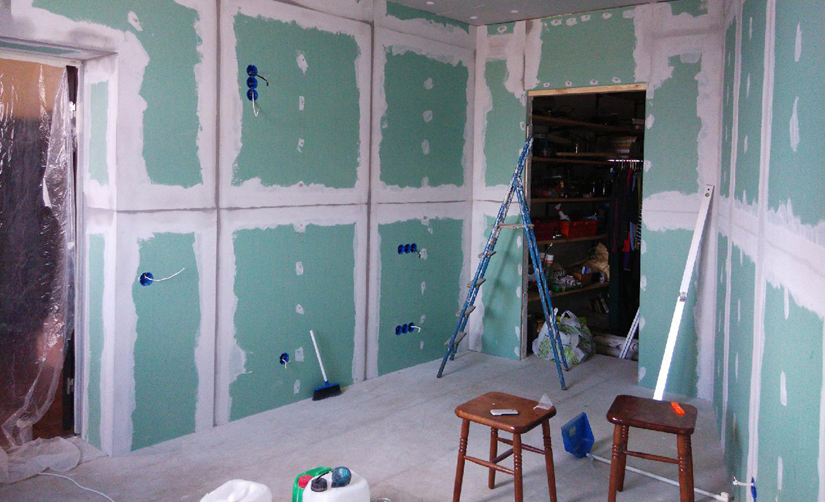 После монтажа ГК первый этап – подготовка поверхности и грунтование. После высыхания нанести на стены первый слой штукатурной смеси и разровнять. Дождаться отвердевания, затереть неровности. Зашпаклевать поверхность финишным составом, оставить до окончания полимеризации – двое суток. Зашлифовать шкуркой. Стены готовы.