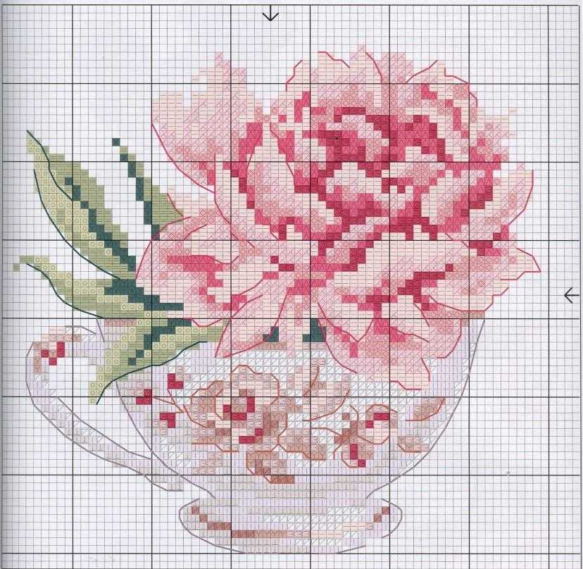 Можно выбрать любую понравившуюся схему. Особое значение имеет выбор цвета. В основном вышивают красные, белые и розовые пионы.