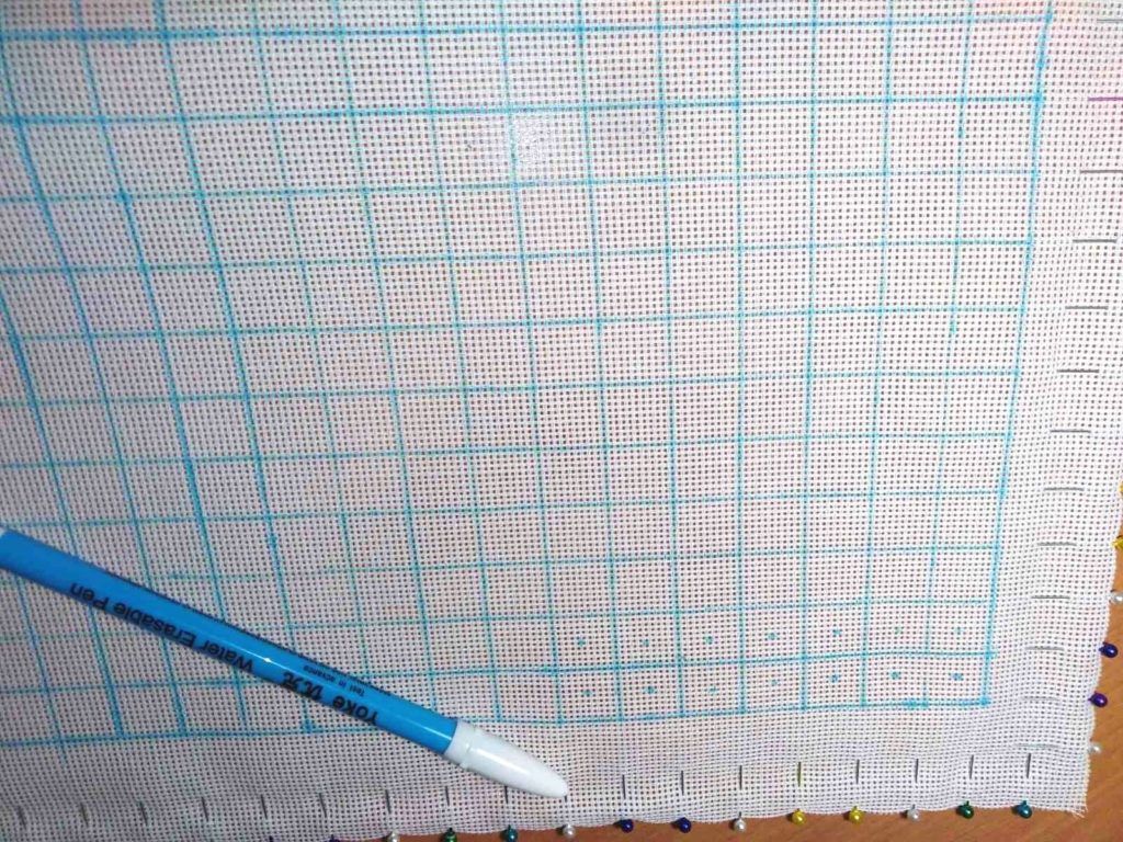 Разметив таким образом отрез, расчерчиваю клетки. Некоторые вышивальщицы применяют для этого нитки контрастного цвета, выполняя стежки через 10 клеток по горизонтали и вертикали. Но мне этот способ не понравился из-за необходимости потом избавляться от наметки.
