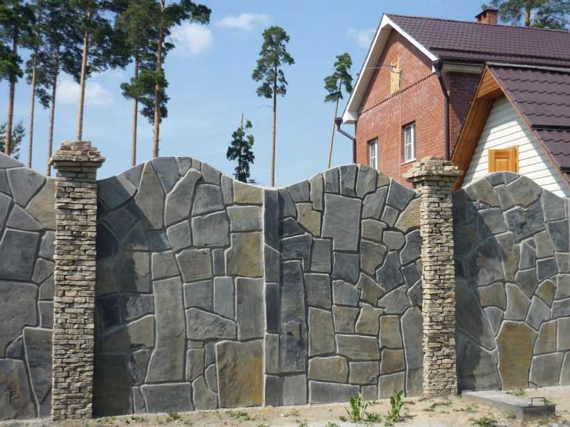 К первому виду относятся ограждения, выполненные по специальной современной технологии. Она заключается в отлитии эксклюзивных рельефных плит. Их изготавливают из высококачественного бетона. Рисунок с точностью повторяет фактуру натурального камня. Эти технологии применяются и при изготовлении крышек и столбов для забора.