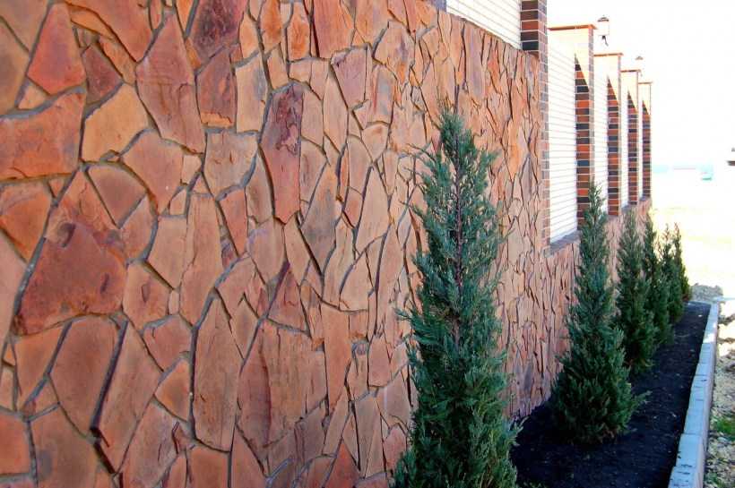 Второй вариант намного проще. В этом случае возводится кирпичный забор, который впоследствии облицовывается искусственным камнем. С этим способом все предельно понятно.